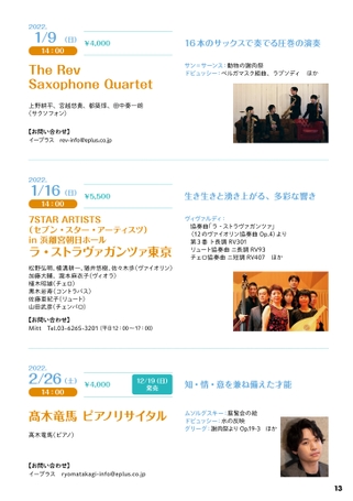 16本のサックスで奏でる圧巻の演奏サン=サーンス:動物の謝肉祭ドビュッシー:ベルガマスク組曲、ラプソディほか生き生きと湧き上がる、多彩な響きヴィヴァルディ:協奏曲「ラ・ストラヴァガンツァ」(12のヴァイオリン協奏曲Op.4)より第3番ト長調RV301リュート協奏曲ニ長調RV93チェロ協奏曲ニ短調RV407ほか2022.1/9(日)14:00¥4,000TheRevSaxophoneQuartet上野耕平、宮越悠貴、都築惇、田中奏一朗(サクソフォン)【お問い合わせ】イープラスrev-info@eplus.co.jp2022.1/16(日)14:00¥5,5007STARARTISTS(セブン・スター・アーティスツ)in浜離宮朝日ホールラ・ストラヴァガンツァ東京松野弘明、横溝耕一、猶井悠樹、佐々木歩(ヴァイオリン)加藤大輔、瀧本⿇⾐⼦(ヴィオラ)植木昭雄(チェロ)黒木岩寿(コントラバス)佐藤亜紀⼦(リュート)⼭田武彦(チェンバロ)【お問い合わせ】MittTel.03-6265-3201(平日12:00〜17:00)2022.2/26(土)14:00¥4,00012/19(日)発売知・情・意を兼ね備えた才能髙木竜馬ピアノリサイタル髙木竜馬(ピアノ)ムソルグスキー:展覧会の絵ドビュッシー:水の反映グリーグ:謝肉祭よりOp.19-3ほか【お問い合わせ】イープラスryomatakagi-info@eplus.co.jp13