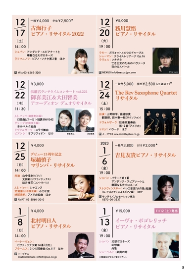 1217一般¥4,000学生¥2,500★古海行子ピアノ・リサイタル2022(土)14:00ショパン:アンダンテ・スピアナートと華麗なる大ポロネーズラフマニノフ:ピアノ・ソナタ第2番ほか¥5,000務川慧悟ピアノ・リサイタル1220(火)19:00ラモー:ガヴォットと6つのドゥーブルシューマン:クライスレリアーナOp.16ラヴェル:ソナチネ亡き王女のためのパヴァーヌ夜のガスパール問Mitt03-6265-3201©TakafumiUeno問NEXUSinfo@nexus.jpn.com©YujiUeno1222(木)11:30¥3,000浜離宮ランチタイムコンサートvol.221御喜美江&大田智美アコーディオンデュオリサイタル1224一般¥5,000学生¥2,500(25歳以下)★TheRevSaxophoneQuartetリサイタル(土)15:00出演:上野耕平、宮越悠貴都築惇、田中奏一朗(サクソフォン)J.S.バッハ(御喜美江編)幻想曲とフーガト短調BWV542グリーグ(内田祥子編):ホルベルク組曲ドヴォルザーク:スラヴ舞曲ピアソラ:オブリヴィオンほか©MarcoBorggreve©JumpeiTainaka御喜美江大田智美ドヴォルザーク:弦楽四重奏曲第12番「アメリカ」トマジ:バラードほか問イープラスrev-info@eplus.co.jp一般¥3,800U18¥2,000★吉見友貴ピアノ・リサイタル202316(金)19:00ショパン:バラード第1番アンダンテ・スピアナートと華麗なる大ポロネーズストラヴィンスキー:バレエ音楽「火の鳥」組曲(G.アゴスティによるピアノ編)ほか問サンライズプロモーション東京0570-00-3337©ShigetoImura113(金)19:00¥15,00011/12(土)発売イーヴォ・ポゴレリッチピアノ・リサイタルショパン:幻想ポロネーズ幻想曲舟歌シューベルト:楽興の時©TomokoHidaki※詳細はP2をご覧ください。©AndrejGrilc51225¥4,000デビュー15周年記念塚越慎子マリンバ・リサイタル(日)14:00共演:山中惇史(ピアノ)太田剣(ソプラノサックス)鉄井孝司(コントラバス)¥4,000北村明日人ピアノ・リサイタル18(日)14:00ベートーヴェン:ピアノ・ソナタ第14番「月光」ブラームス:3つの間奏曲Op.117ほか問イープラスasutokitamura-info@eplus.co.jpJ.S.バッハ:シャコンヌ武満徹(山中惇史編):小さな空挾間美帆:アメリカ組曲ほか問AMATI03-3560-3010