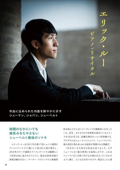 エリック・ルーピアノ・リサイタル作品に込められた内面を鮮やかに示すシューマン、ショパン、シューベルト暗闇のなかにいても微笑みをたやさないシューベルト最後のソナタエリック・ルーは2015年の第17回ショパン国際ピアノコンクールで17歳にして第4位入賞を果たし、2018年のリーズ国際ピアノコンクールでは優勝という快挙を成し遂げたピアニスト。現在は世界各地で演奏活動を行ない、ワーナー・クラシックスと専属契約を結んでからはレコーディングも積極的に行なっている。近年、ますますその音楽性を深めているエリックが2026年2月、浜離宮朝日ホールに初登場する。プログラムはシューマンにショパン、シューベルトで、彼の美音と歌心あふれる演奏が発揮される楽曲だ。「自分がいま大好きな作品を並べました。まずシューマンの『森の情景』を演奏しますが、これはシューマンがこの世に対するお別れを言っているかのように感じ、とても心を打つのです。残念なことに演2