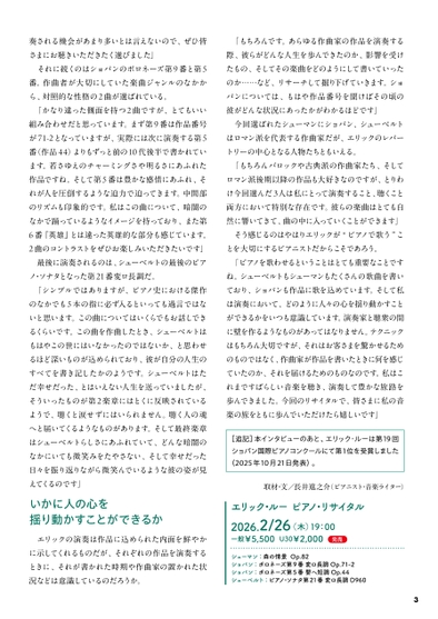 奏される機会があまり多いとは言えないので、ぜひ皆さまにお聴きいただきたく選びました」それに続くのはショパンのポロネーズ第9番と第5番。作曲者が大切にしていた楽曲ジャンルのなかから、対照的な性格の2曲が選ばれている。「かなり違った側面を持つ2曲ですが、とてもいい組み合わせだと思っています。まず第9番は作品番号が71-2となっていますが、実際には次に演奏する第5番(作品44)よりもずっと前の10代後半で書かれています。若さゆえのチャーミングさや明るさにあふれた作品ですね。そして第5番は豊かな感情にあふれ、それが人を圧倒するような迫力で迫ってきます。中間部のリズムも印象的です。私はこの曲について、暗闇のなかで踊っているようなイメージを持っており、また第6番『英雄』とは違った英雄的な部分も感じています。2曲のコントラストをぜひお楽しみいただきたいです」最後に演奏されるのは、シューベルトの最後のピアノ・ソナタとなった第21番変ロ長調だ。「シンプルではありますが、ピアノ史における傑作のなかでも5本の指に必ず入るといっても過言ではないと思います。この曲についてはいくらでもお話しできるくらいです。この曲を作曲したとき、シューベルトはもはやこの世にはいなかったのではないか、と思わせるほど深いものが込められており、彼が自分の人生のすべてを書き記したかのようです。シューベルトはただ幸せだった、とはいえない人生を送っていましたが、そういったものが第2楽章にはとくに反映されているようで、聴くと涙せずにはいられません。聴く人の魂へと届いてくるようなものがあります。そして最終楽章はシューベルトらしさにあふれていて、どんな暗闇のなかにいても微笑みをたやさない、そして幸せだった日々を振り返りながら微笑んでいるような彼の姿が見えてくるのです」いかに人の心を揺り動かすことができるかエリックの演奏は作品に込められた内面を鮮やかに示してくれるものだが、それぞれの作品を演奏するときに、それが書かれた時期や作曲家の置かれた状況などは意識しているのだろうか。「もちろんです。あらゆる作曲家の作品を演奏する際、彼らがどんな人生を歩んできたのか、影響を受けたもの、そしてその楽曲をどのようにして書いていったのか……など、リサーチして掘り下げていきます。ショパンについては、もはや作品番号を聞けばその頃の彼がどんな状況にあったかがわかるほどです」今回選ばれたシューマンにショパン、シューベルトはロマン派を代表する作曲家だが、エリックのレパートリーの中心となる人物たちともいえる。「もちろんバロックや古典派の作曲家たち、そしてロマン派後期以降の作品も大好きなのですが、とりわけ今回選んだ3人は私にとって演奏すること、聴くこと両方において特別な存在です。彼らの楽曲はとても自然に響いてきて、曲の中に入っていくことができます」そう感じるのはやはりエリックが“ピアノで歌う”ことを大切にするピアニストだからこそであろう。「ピアノを歌わせるということはとても重要なことですね。シューベルトもシューマンもたくさんの歌曲を書いており、ショパンも作品に歌を込めています。そして私は演奏において、どのように人々の心を揺り動かすことができるかをいつも意識しています。演奏家と聴衆の間に壁を作るようなものがあってはなりません。テクニックはもちろん大切ですが、それはお客さまを驚かせるためのものではなく、作曲家が作品を書いたときに何を感じていたのか、それを届けるためのものなのです。私はこれまですばらしい音楽を聴き、演奏して豊かな旅路を歩んできました。今回のリサイタルで、皆さまに私の音楽の旅をともに歩んでいただけたら嬉しいです」[追記]本インタビューのあと、エリック・ルーは第19回ショパン国際ピアノコンクールにて第1位を受賞しました(2025年10月21日発表)。取材・文/長井進之介(ピアニスト・音楽ライター)エリック・ルーピアノ・リサイタル2026.2/26(木)19:00一般¥5,500U30¥2,000完売シューマン:森の情景Op.82ショパン:ポロネーズ第9番変ロ長調Op.71-2ショパン:ポロネーズ第5番嬰ヘ短調Op.44シューベルト:ピアノ・ソナタ第21番変ロ長調D9603