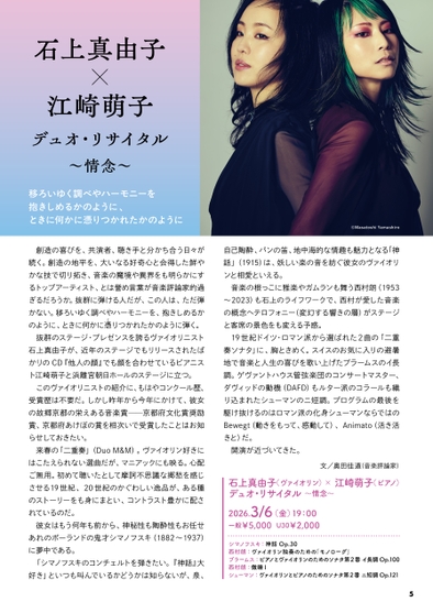 石上真由子江崎萌子デュオ・リサイタル~情念~移ろいゆく調べやハーモニーを抱きしめるかのように、ときに何かに憑りつかれたかのようにと創造の喜びを、共演者、聴き手と分かち合う日々が続く。創造の地平を、大いなる好奇心と会得した鮮やかな技で切り拓き、音楽の魔境や異界をも明らかにするトップアーティスト、とは誉め言葉が音楽評論家的過ぎるだろうか。抜群に弾ける人だが、この人は、ただ弾かない。移ろいゆく調べやハーモニーを、抱きしめるかりつかれたかのように弾く。のように、ときに何かに憑抜群のステージ・プレゼンスを誇るヴァイオリニスト石上真由子が、近年のステージでもリリースされたばかりのCD『他人の顔』でも顔を合わせているピアニスト江崎萌子と浜離宮朝日ホールのステージに立つ。このヴァイオリニストの紹介に、もはやコンクール歴、受賞歴は不要だ。しかし昨年から今年にかけて、彼女の故郷京都の栄えある音楽賞──京都府文化賞奨励賞、京都府あけぼの賞を相次いで受賞したことはお知らせしておきたい。来春の「二重奏」(DuoM&M)。ヴァイオリン好きにはこたえられない選曲だが、マニアックにも映る。心配ご無用。初めて聴いたとして摩訶不思議な郷愁を感じさせる19世紀、20世紀のかぐわしい逸品が、ある種のストーリーをも身にまとい、コントラスト豊かに配されているのだ。彼女はもう何年も前から、神秘性も陶酔性もお任せあれのポーランドの鬼才シマノフスキ(1882~1937)に夢中である。「シマノフスキのコンチェルトを弾きたい。『神話』大好き」といつも叫んでいるかどうかは知らないが、泉、©MasatoshiYamashiro自己陶酔、パンの笛、地中海的な情趣も魅力となる「神話」(1915)は、妖しい楽の音を紡ぐ彼女のヴァイオリンと相愛といえる。音楽の根っこに雅楽やガムランも舞う西村朗(1953~2023)も石上のライフワークで、西村が愛した音楽の概念ヘテロフォニー(変幻する響きの層)がステージと客席の景色をも変える予感。19世紀ドイツ・ロマン派から選ばれた2曲の「二重奏ソナタ」に、胸ときめく。スイスのお気に入りの避暑地で音楽と人生の喜びを歌い上げたブラームスのイ長調。ゲヴァントハウス管弦楽団のコンサートマスター、ダヴィッドの動機(DAFD)もルター派のコラールも織り込まれたシューマンのニ短調。プログラムの最後を駆け抜けるのはロマン派の化身シューマンならではのBewegt(動きをもって、感動して)、Animato(活き活きと)だ。開演が近づいてきた。文/奥田佳道(音楽評論家)石上真由子(ヴァイオリン)×江崎萌子(ピアノ)デュオ・リサイタル~情念~2026.3/6(金)19:00一般¥5,000U30¥2,000シマノフスキ:神話Op.30西村朗:ヴァイオリン独奏のための「モノローグ」ブラームス:ピアノとヴァイオリンのためのソナタ第2番イ長調Op.100西村朗:微睡Ⅰシューマン:ヴァイオリンとピアノのためのソナタ第2番ニ短調Op.1215